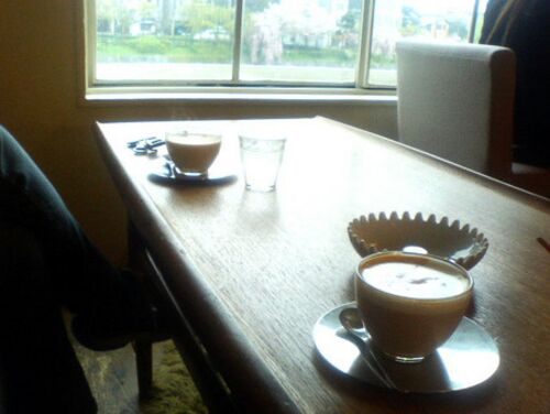 ちょっくら、キャラメルティをのみに五条河原町のefishやってきました。 それにしても、よく雨がふります。 席から眺める、対岸の桜も葉桜になってきましたよ。